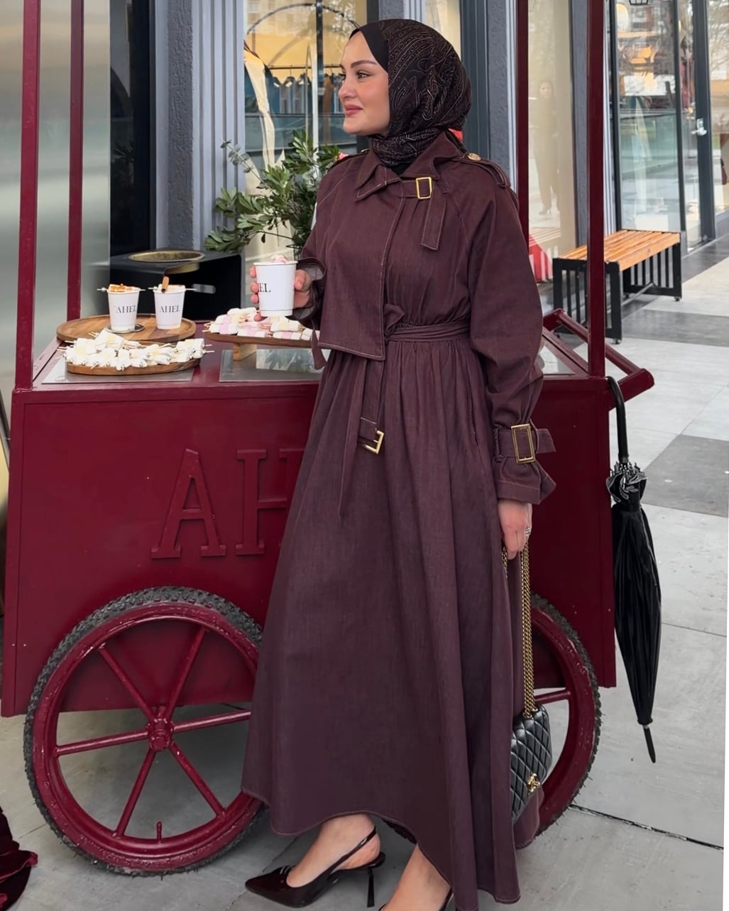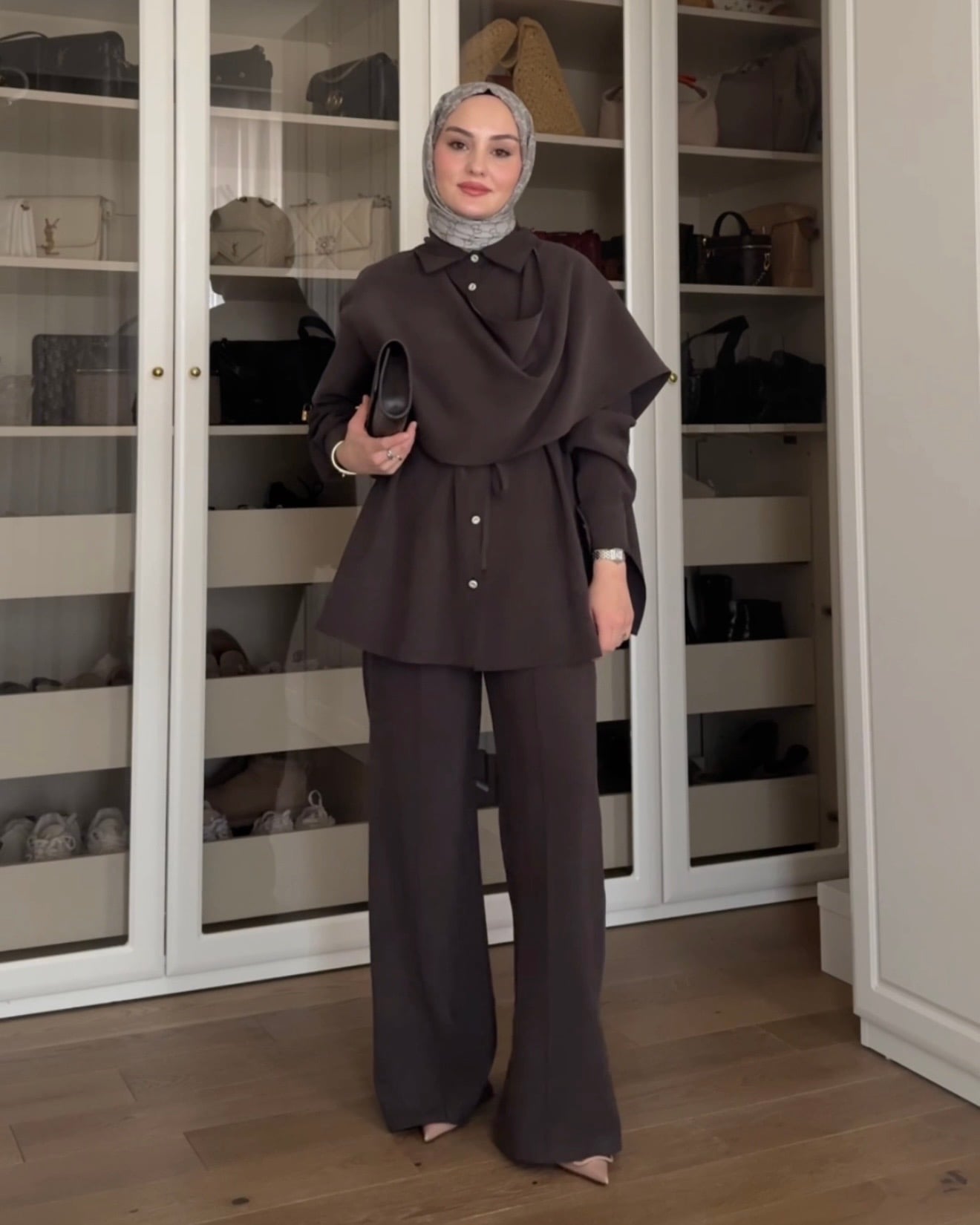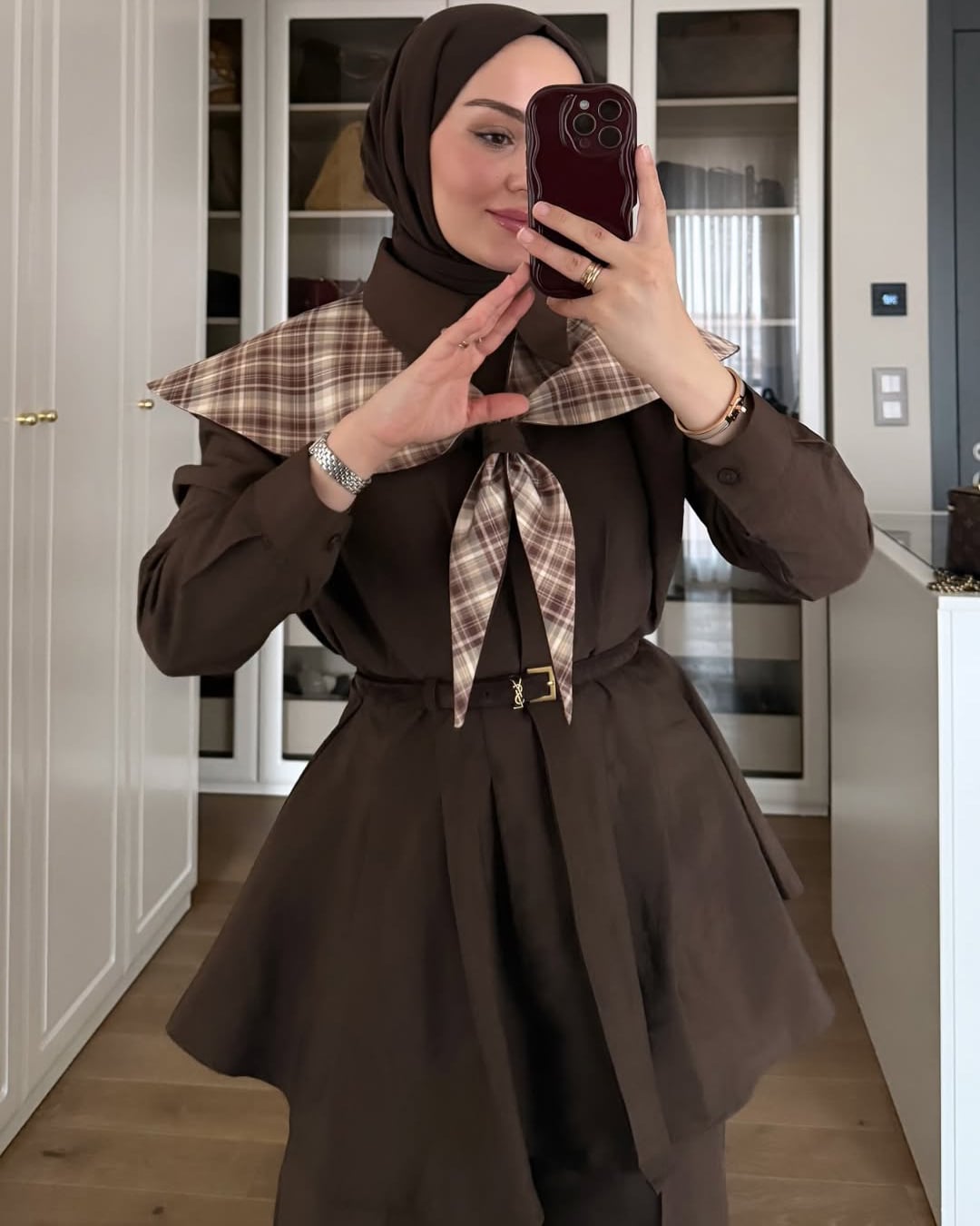 Yaka Ekoseli Bel Pileli Pamuklu Takım - Kahve