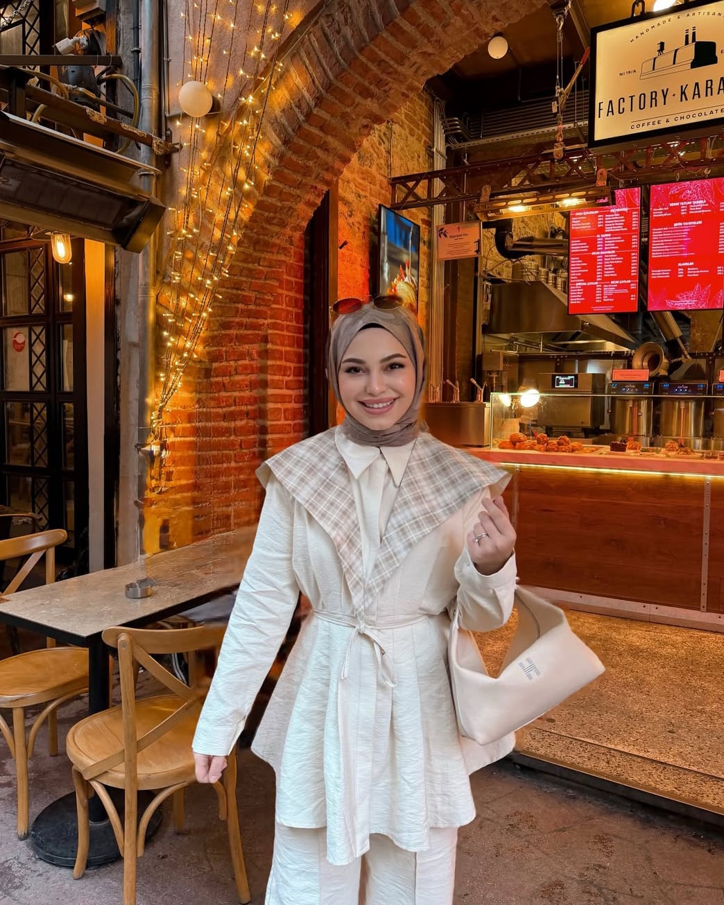 Bel Pileli Geniş Yakalı Ekose Takım - Bej