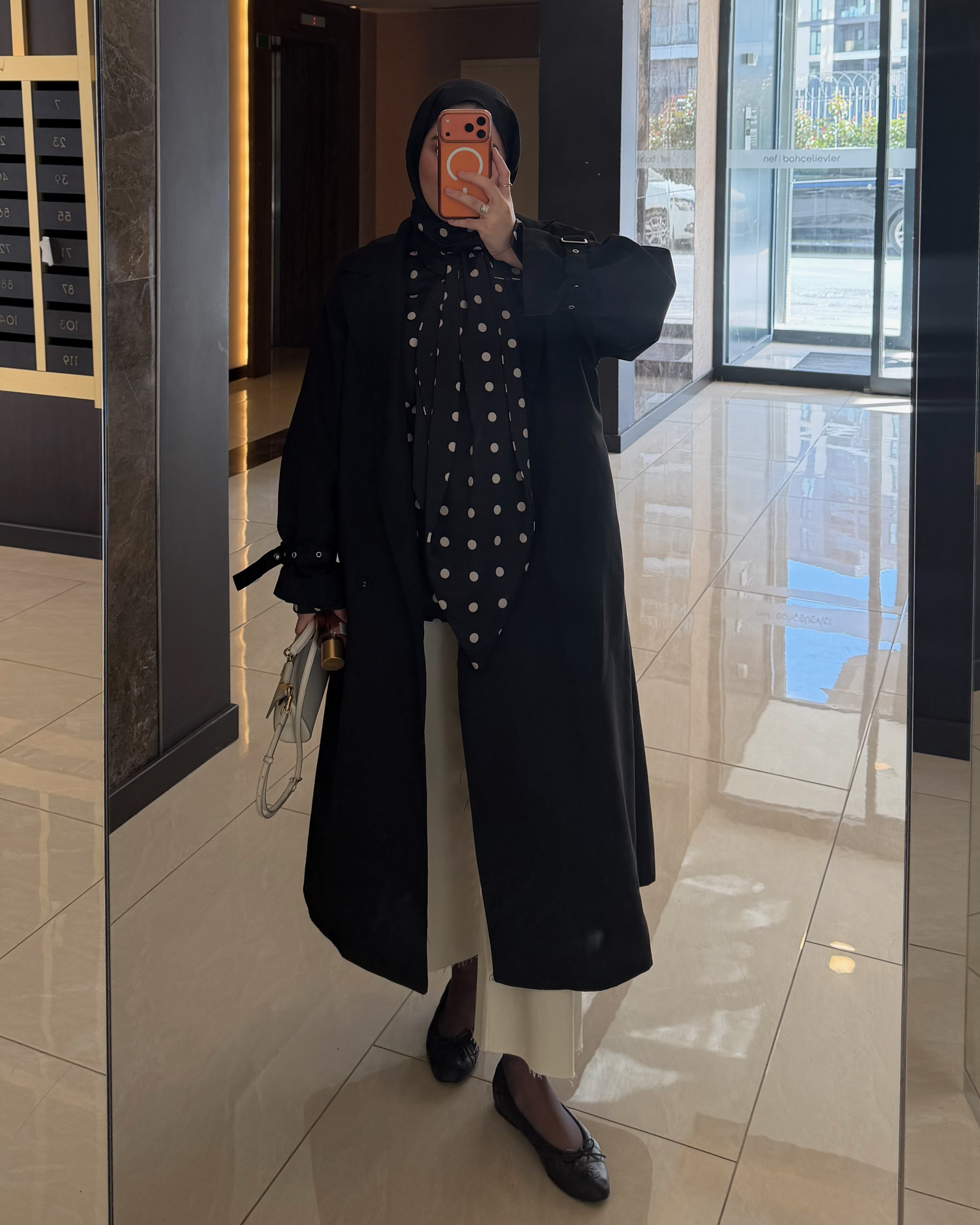 Kemer Detaylı Uzun Kruvaze Trençkot - Siyah
