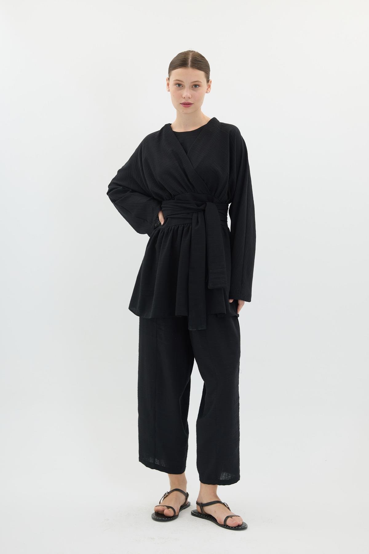 Aria Kuşaklı Keten Takım - Siyah (7219-Siyah)