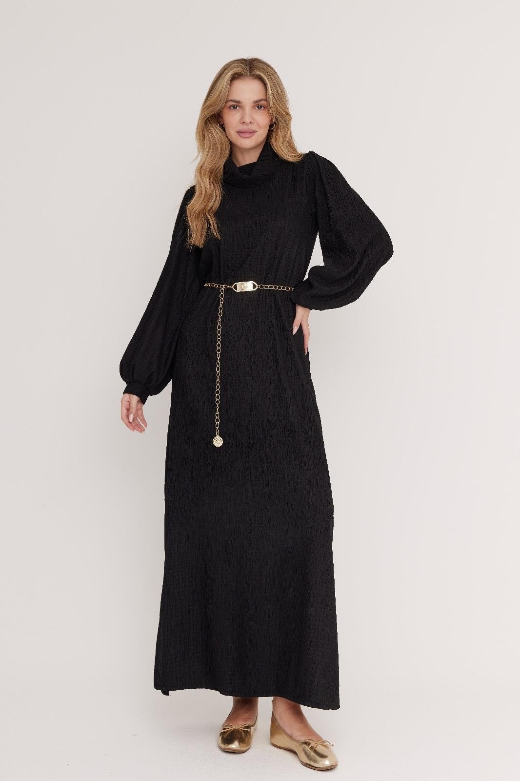 Jenika Gold Kemer Detaylı Bürümcük Elbise - Siyah (7076-Siyah)