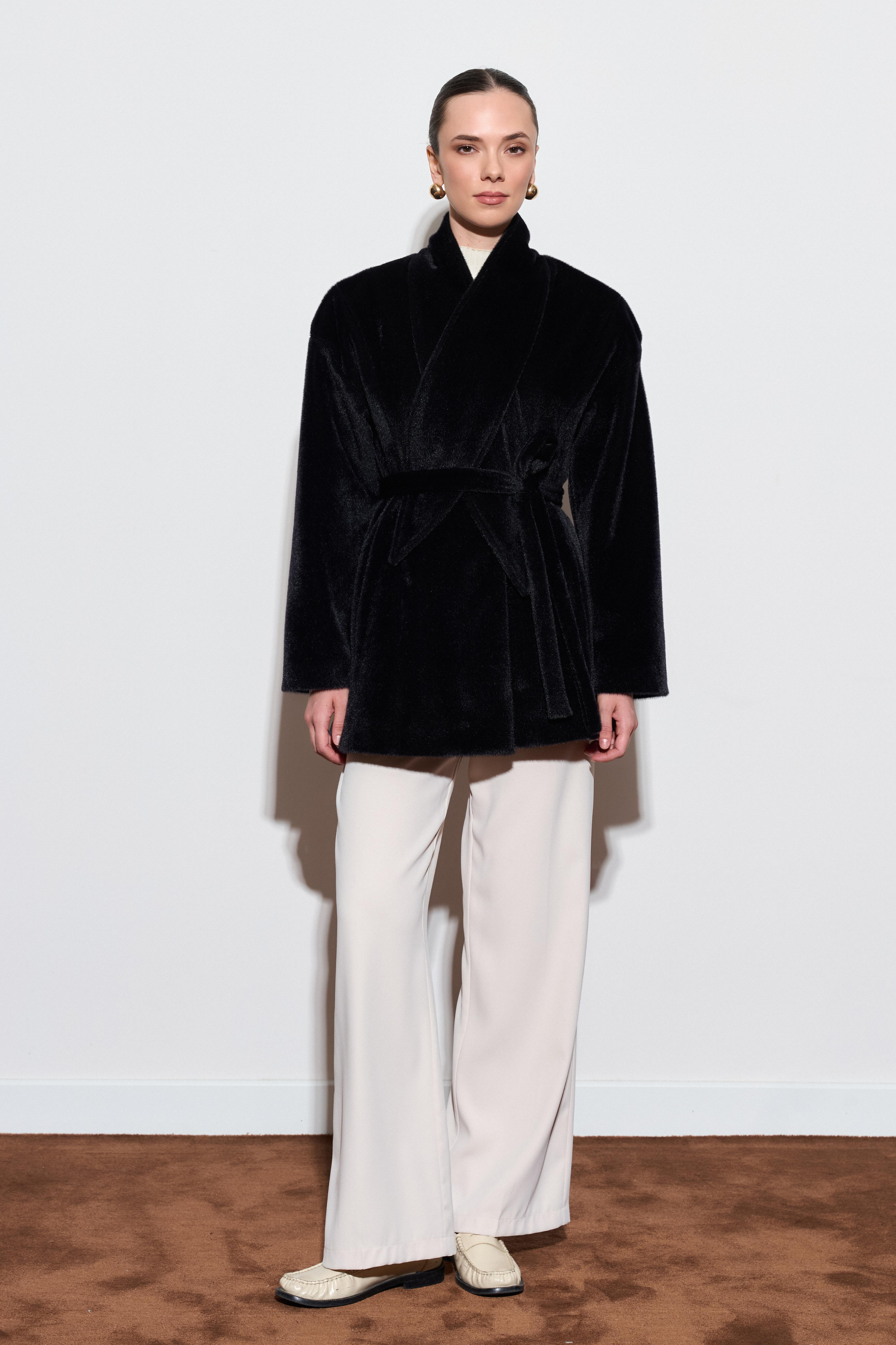Menra Belden Oturmalı Yaka Fiyonklu Kaşe Ceket - Siyah (6900-Siyah)