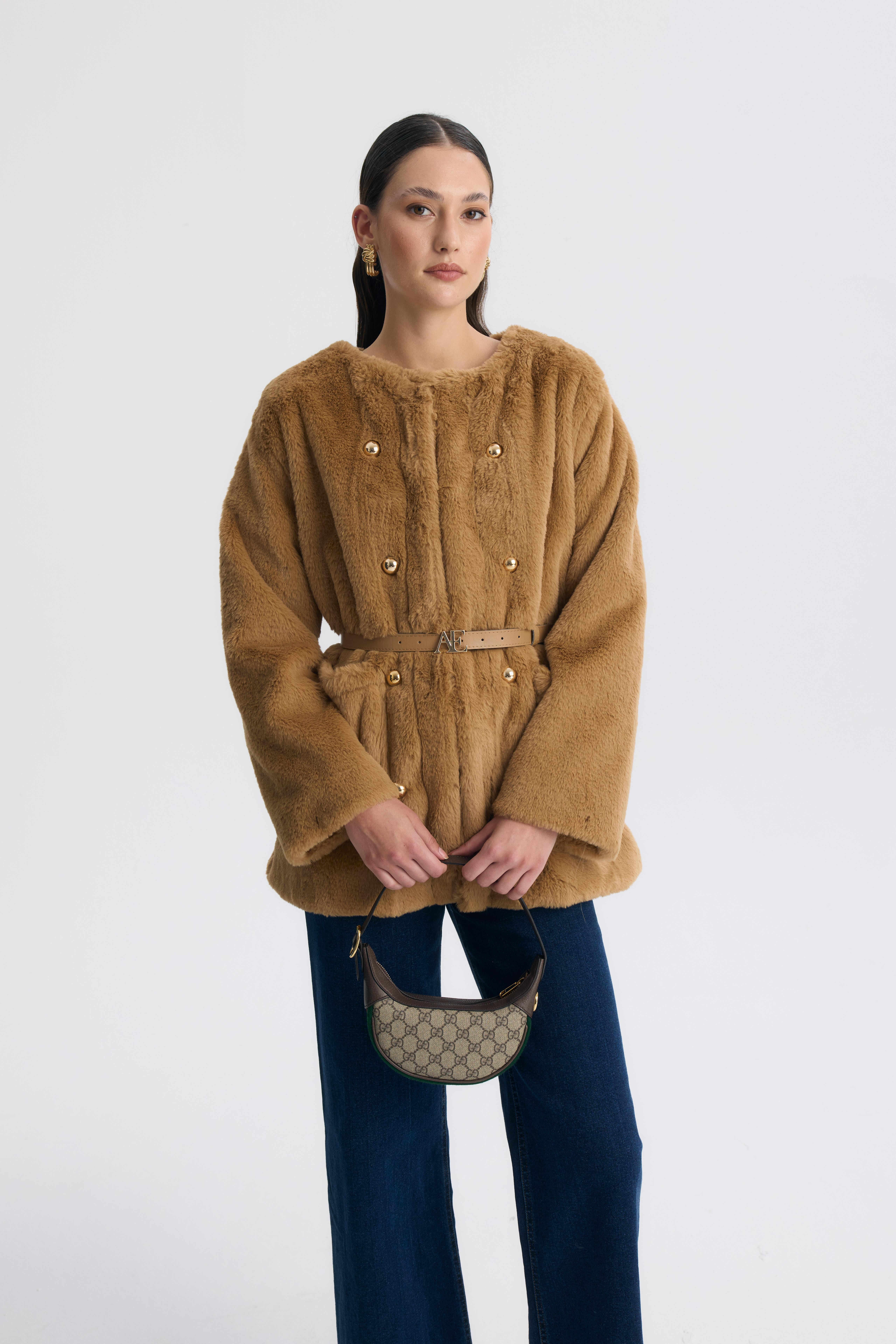 Fayanna Cep Detay Peluş Ceket - Bej (6404-Bej)
