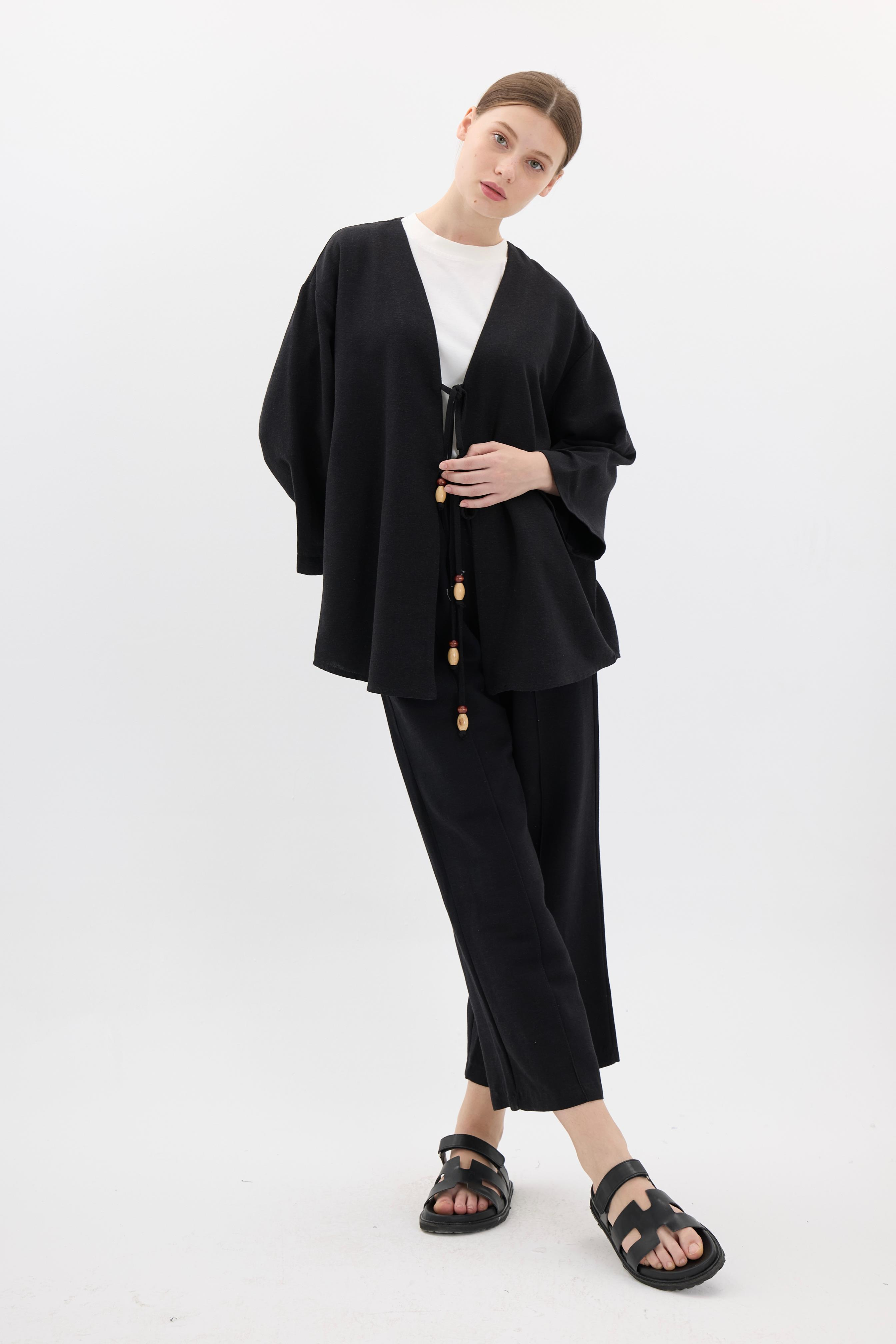İp Bağlamalı Keten Takım - Siyah (N20018-Siyah)