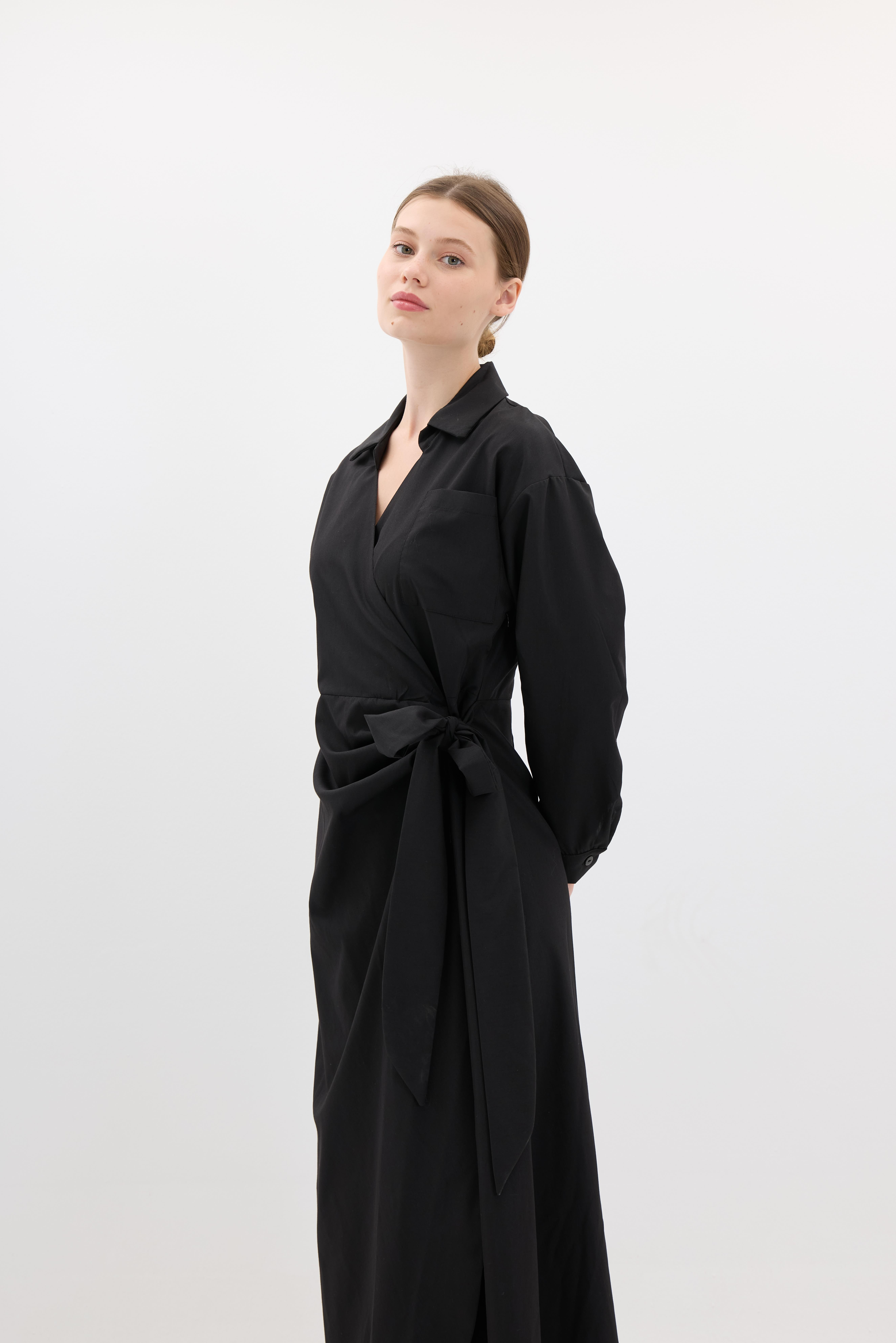 Lai Belden Bağlamalı Poplin Elbise - Siyah