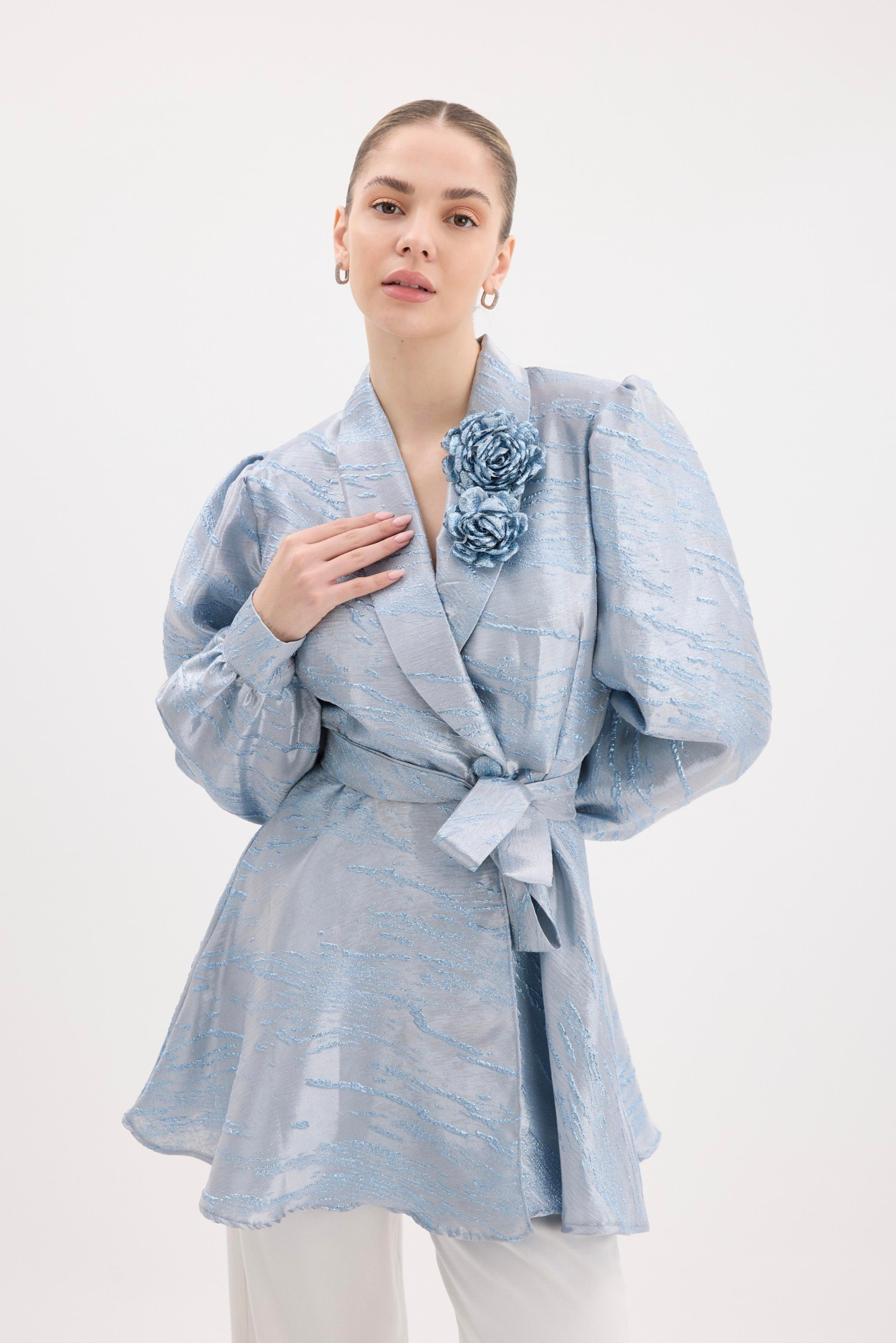 kruvaze yaka , önden tek düğmeli , balon kollu , manşet kol detaylı , seyyar kuşaklı , aksesuar üzerinde dahildir .