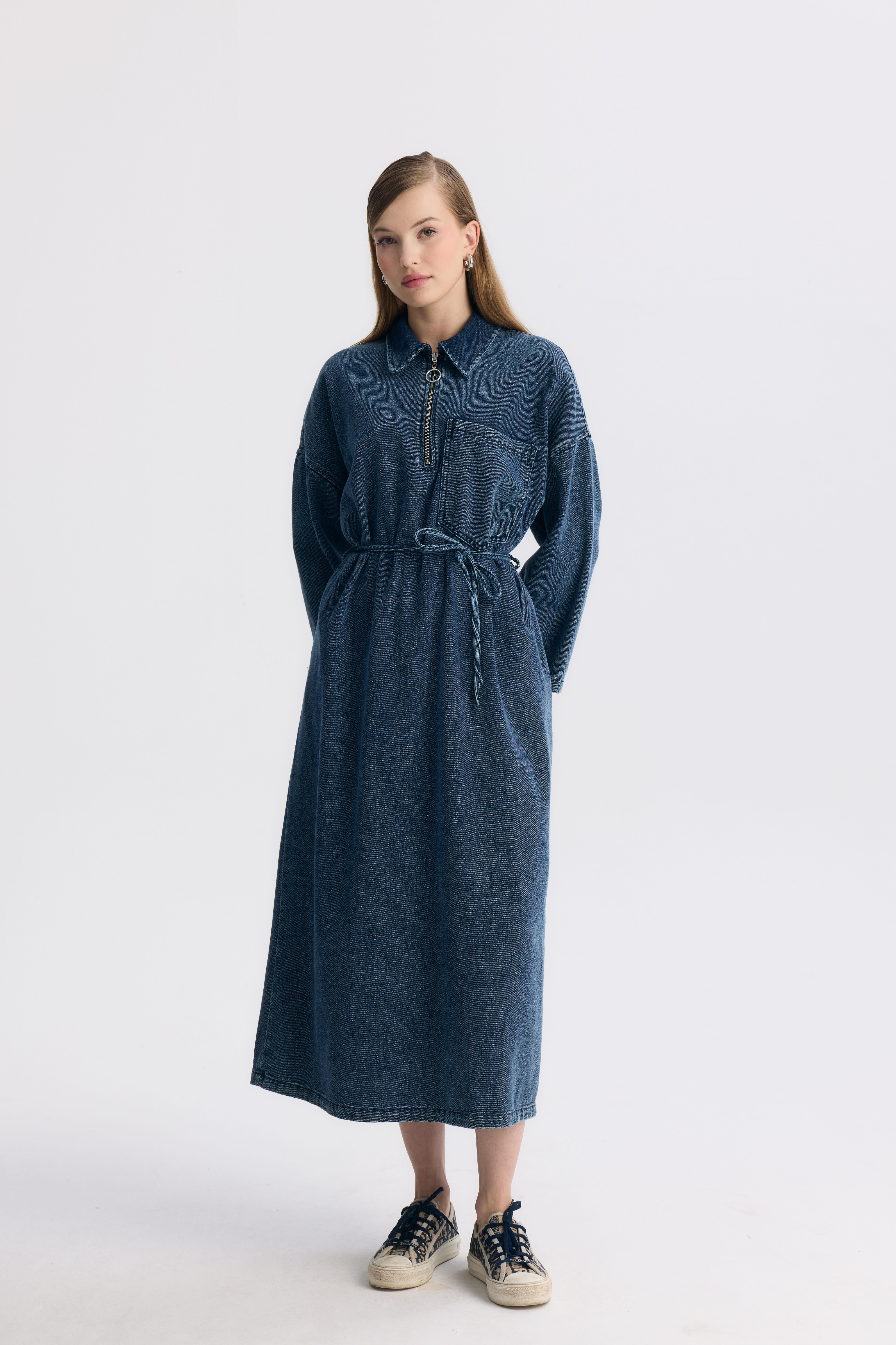 Denisa Cep Detay Fermuarlı Kot Elbise - Mavi (9006-Mavi)