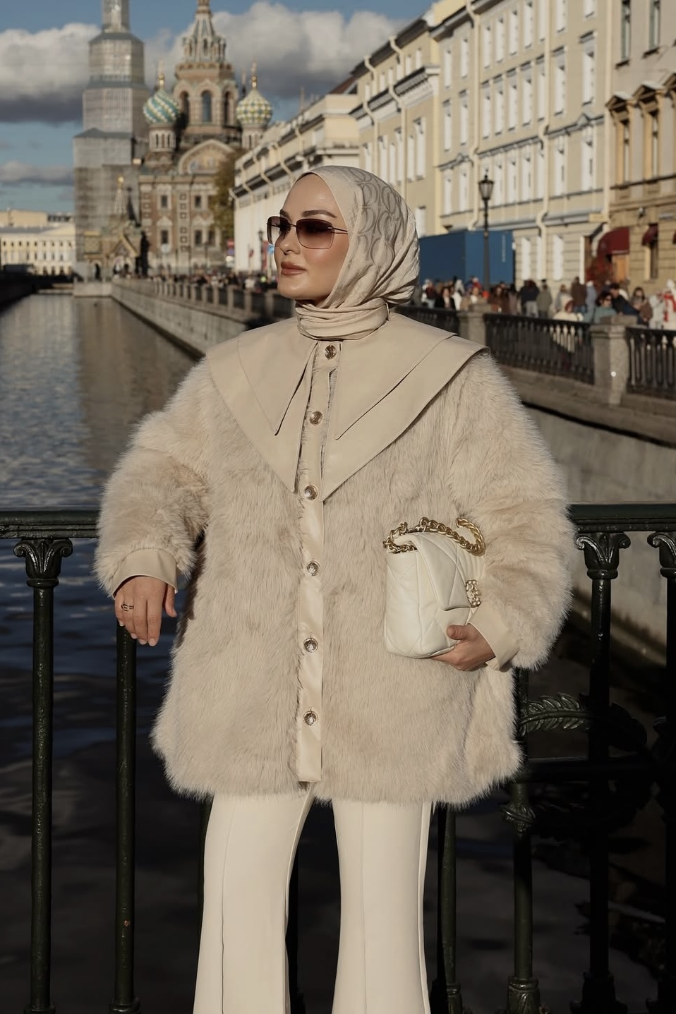 Şıklık ve zarafeti bir araya getiren bu kürk kumaş kaban, deri detayları ve gold düğme tasarımıyla lüks bir duruş sergiler. Deri yaka ve manşet detayları, modele modern bir dokunuş kazandırırken, kuşaklı bel formu vücut hatlarını zarifçe vurgular. Astarlı yapısı sayesinde soğuk havalarda sıcak tutarken, cepleriyle de konfor sunar. Günlük kombinlerden özel davetlere kadar her ortamda stilinizi ön plana çıkarır.
