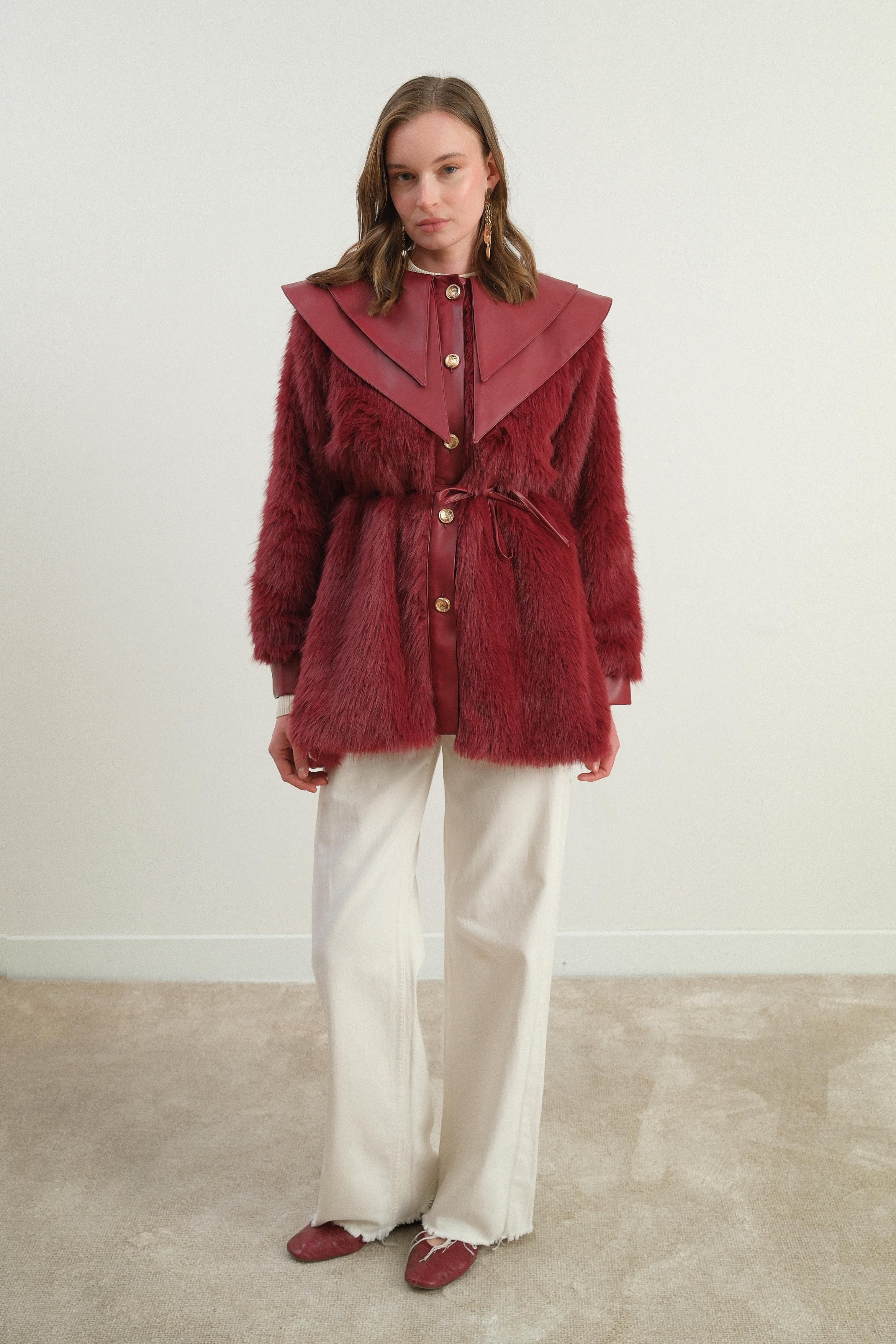 Şıklık ve zarafeti bir araya getiren bu kürk kumaş kaban, deri detayları ve gold düğme tasarımıyla lüks bir duruş sergiler. Deri yaka ve manşet detayları, modele modern bir dokunuş kazandırırken, kuşaklı bel formu vücut hatlarını zarifçe vurgular. Astarlı yapısı sayesinde soğuk havalarda sıcak tutarken, cepleriyle de konfor sunar. Günlük kombinlerden özel davetlere kadar her ortamda stilinizi ön plana çıkarır.