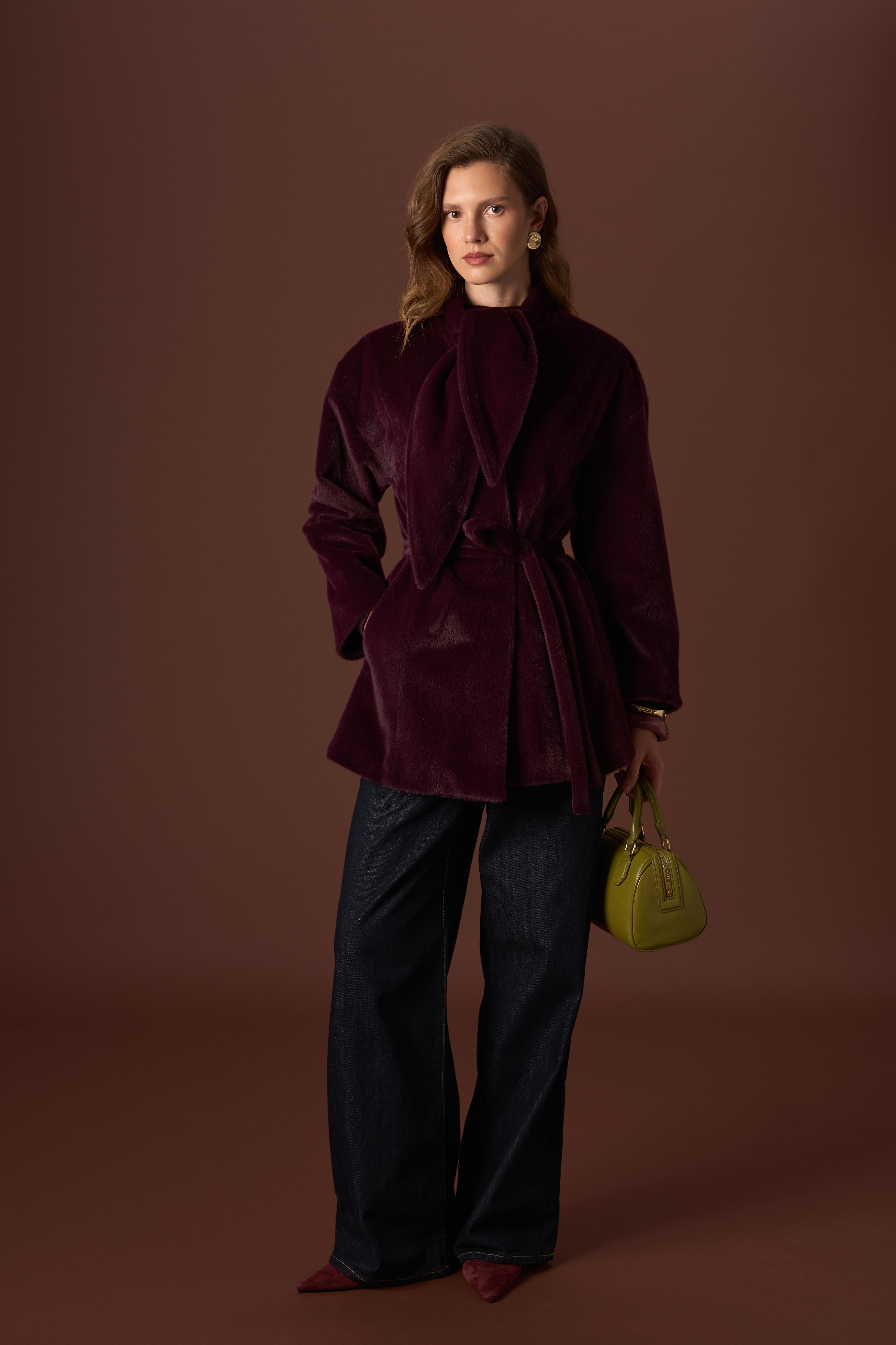 Menra Belden Oturmalı Yaka Fiyonklu Kaşe Kaban - Mürdüm