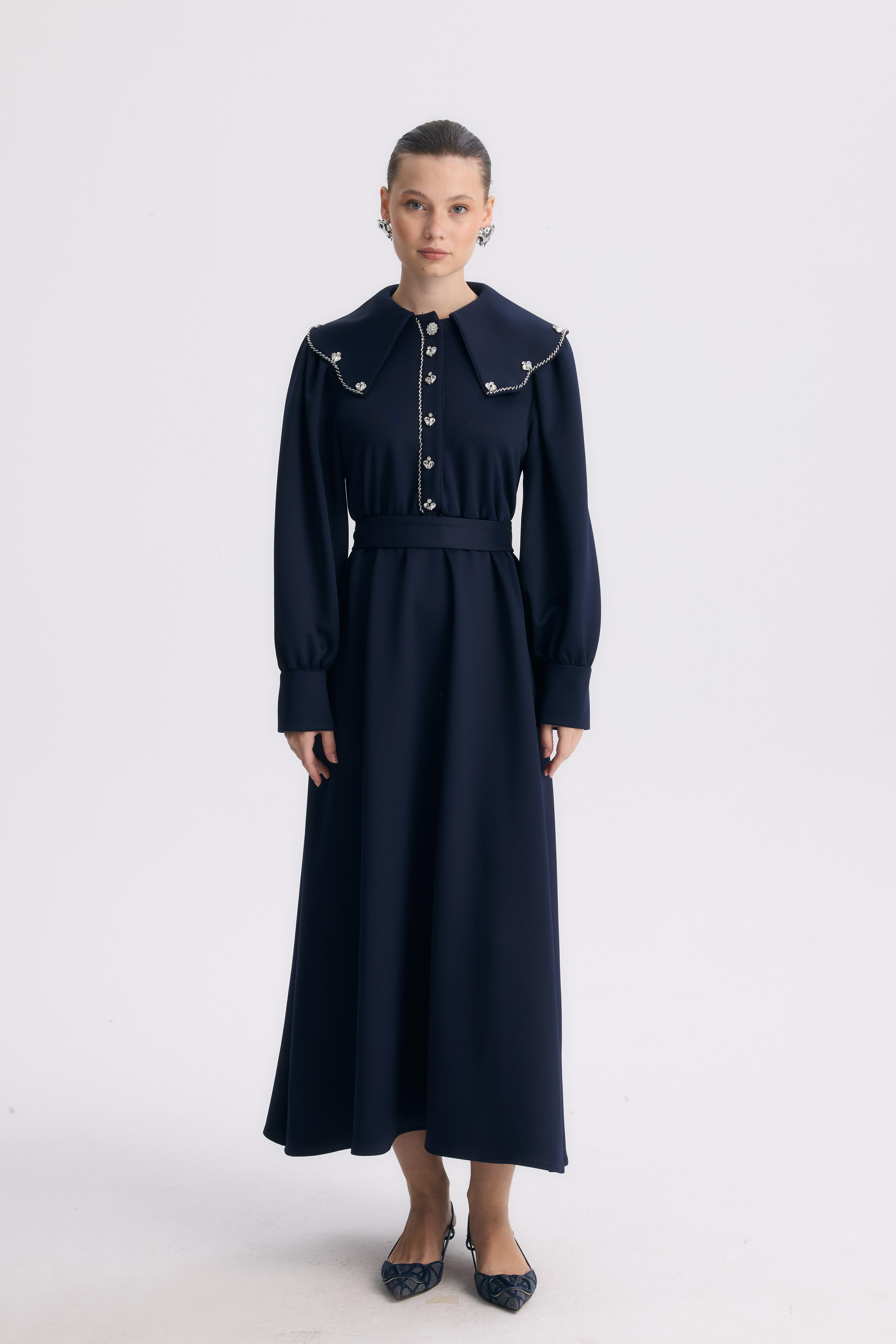 Nora Yakalı İşleme Detay Elbise - Lacivert (7222-Lacivert)