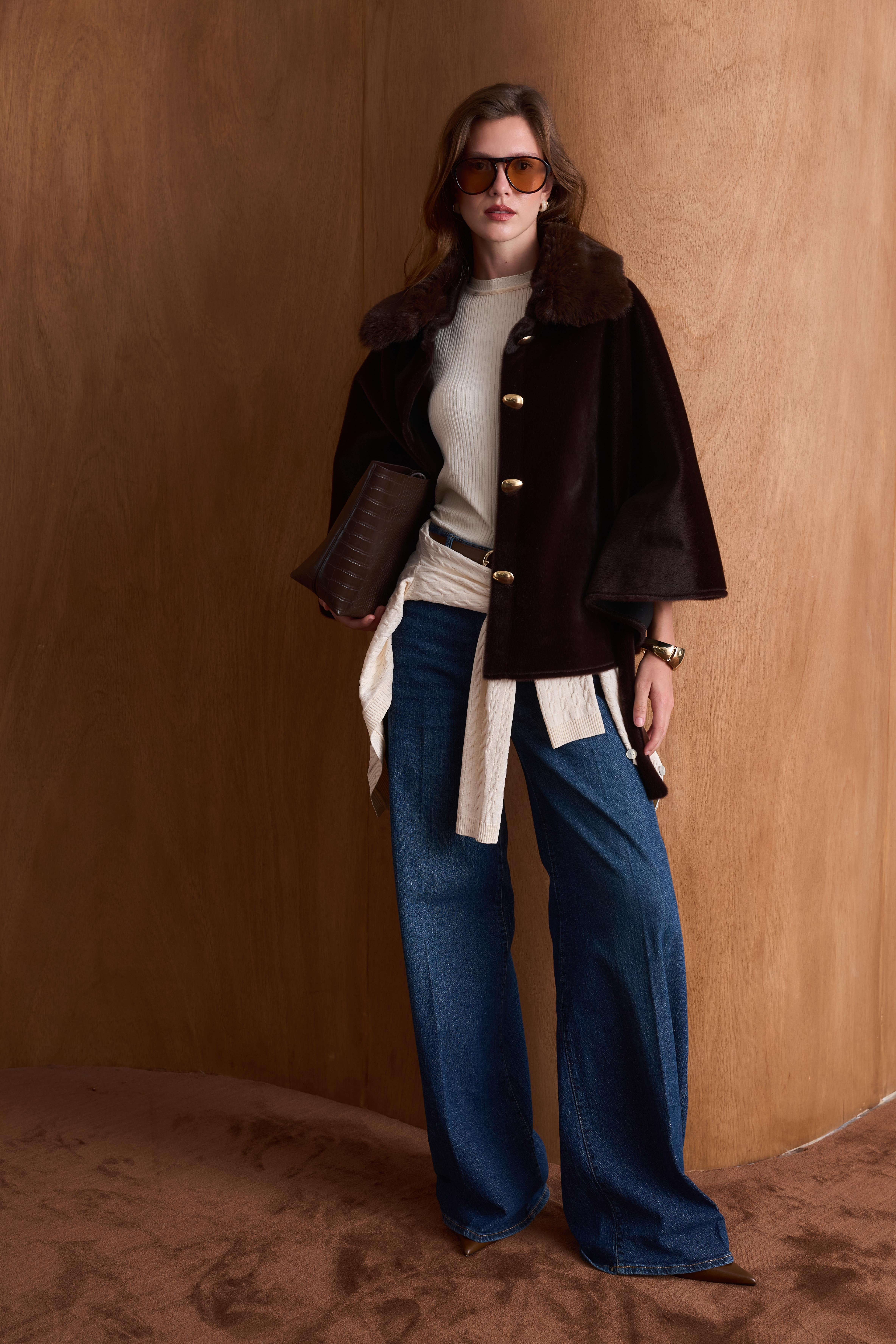 • Boy: 70 cm • Kumaş: Gold Fox • Kürklü yaka detayı. Takıp çıkarılabilirdir. • Önden düğmeli ve kuşaklı tasarım. • Rahat kesim, modern siluet, panço şeklindedir.